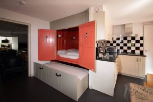 - 5-person apartment, private bathroom and kitchen – €850 (€170 per person). Room with 3 single beds, 2-person box bed in the kitchen. Fits a 6th person on a pull-out bed if you don’t mind sharing your space (see photo). Only 2 available.